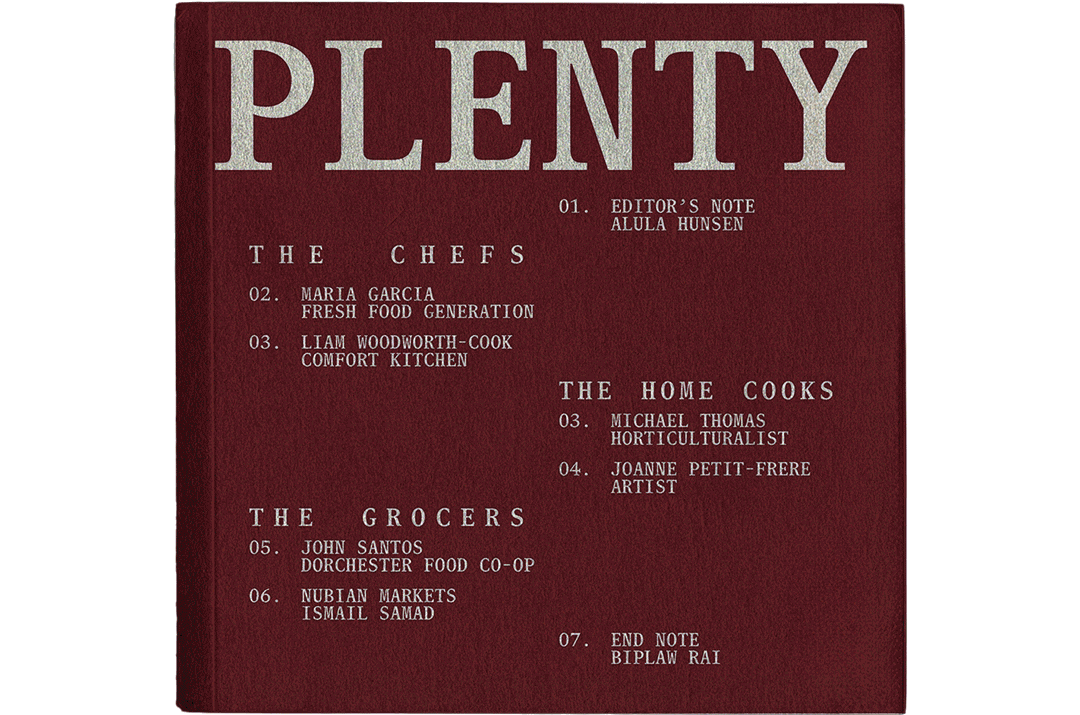 Plenty features essays by Nubian Market’s Ismail Samad and Ujima Restaurant Fellow Biplaw Rai; interviews with Fresh Food Generation’s Maria Garcia and former Dorchester Food Co-op General Manager John Santos; poetry and text by Comfort Kitchen’s Liam Woodworth-Cook; reflections from members Joanne Petit-Frere and Michael Thomas; and images that center necessities and frivolities in cuisine. Edited by Alula Hunsen, with interviews by Bex Oluwatoyin Thompson and Jard Lerebours.